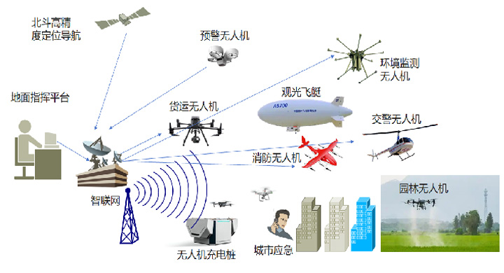低空經濟的概念:低空經濟(Low-altitude Economy)是一種綜合性低空服務型新質生產力的經濟形態。 它以低空飛行服務活動為核心,以有人或無人駕駛飛行器為載體、通過低空安全智聯網和北斗高精度導航控制平臺等新技術組成的動態空域聯動系統,實現對社會的快速、高效和安全的經濟服務。
