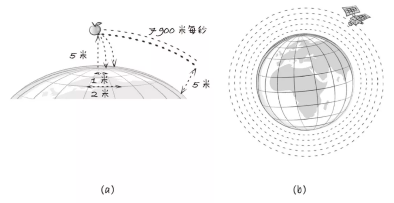 牛頓登上了高處,手拿著蘋果讓它無初速度落下,僅僅1秒之后它就落在了地面之上(如圖a)。如果我們在水平方向給蘋果一個1m/s的速度,蘋果在下落的過程中還會在水平方向上運動一段距離,這個距離就是1m(因為只運動了1秒鐘,速度也只有1m/s);由此類推,水平速度為2m/s時,落點距離我們2m; ……;如果蘋果水平速度為7900m/s,蘋果落點應該距離我們7900m,但事實卻并非如此。