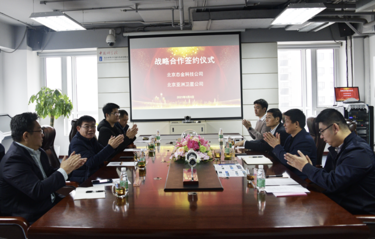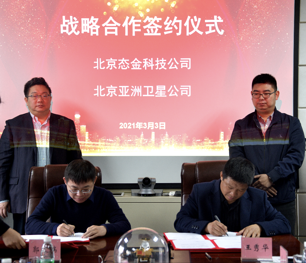 2021年3月3日,北京態(tài)金科技有限公司(下稱“態(tài)金科技”)與北京亞洲衛(wèi)星通信技術(shù)有限公司(下稱“亞洲衛(wèi)星”)于亞洲衛(wèi)星總部正式簽署戰(zhàn)略合作協(xié)議。態(tài)金科技董事長郭瑞、營銷總監(jiān)張凱翔、亞洲衛(wèi)星董事長王秀華、總工程師宋文輝等領(lǐng)導(dǎo)出席并見證了本次簽約儀式。