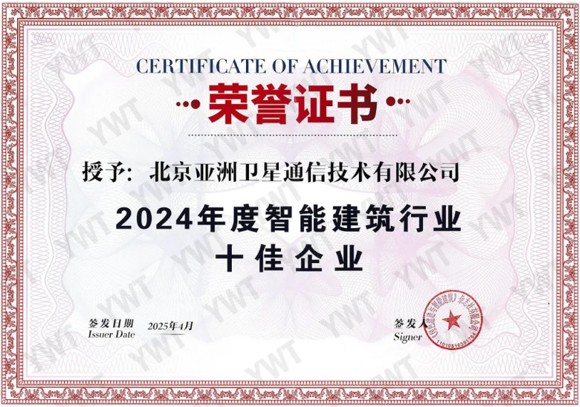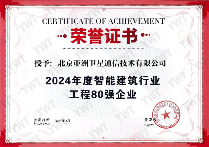 北京亞洲衛星通信技術有限公司榮膺 “2024年度智能建筑行業十佳企業” 和 “2024年度智能建筑行業工程80強企業” 稱號。該榮譽稱號經國家住建部、中國建筑業協會主辦的《綠色建造與智能建筑》雜志發布。